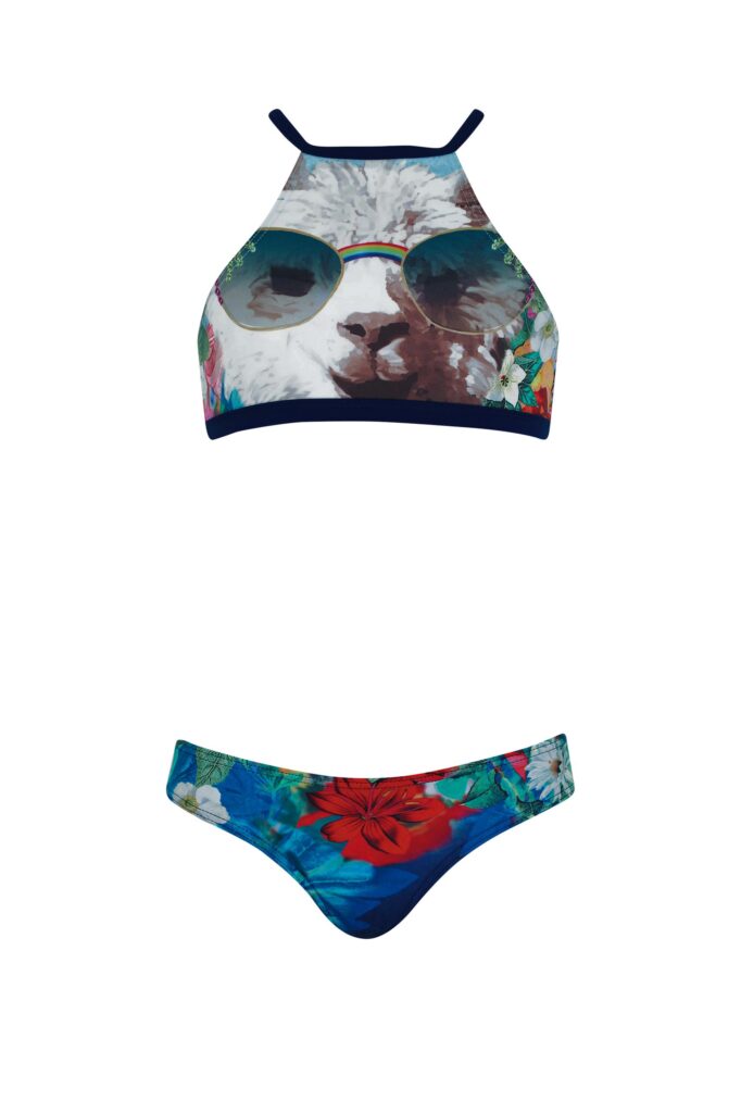 This design is also available in a one-piece swimsuit, a boyleg short with gathers at each side and a white tshirt with the same print and the words 'summer vibes' so that your daughter can create a complete look.